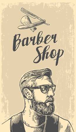 流行に敏感な理髪店で髭剃りですね 黒と白のベクトル イラストやタイポグラフィの要素 手描き下ろしビンテージ ポスター ラベル バナー Web の彫刻の イラスト素材 ベクタ Image